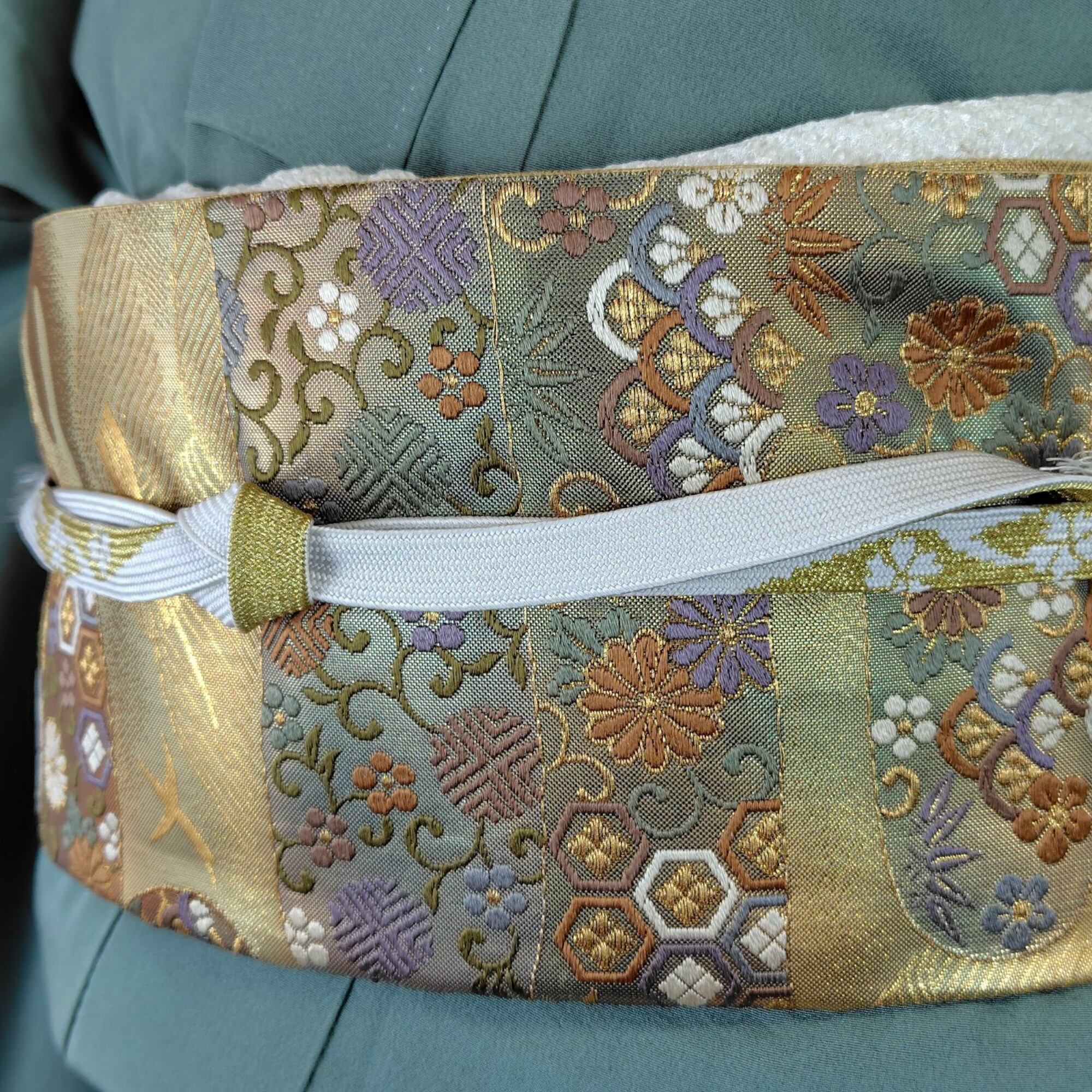 帯は慶事にふさわしく、佐賀錦唐織の金糸の袋帯