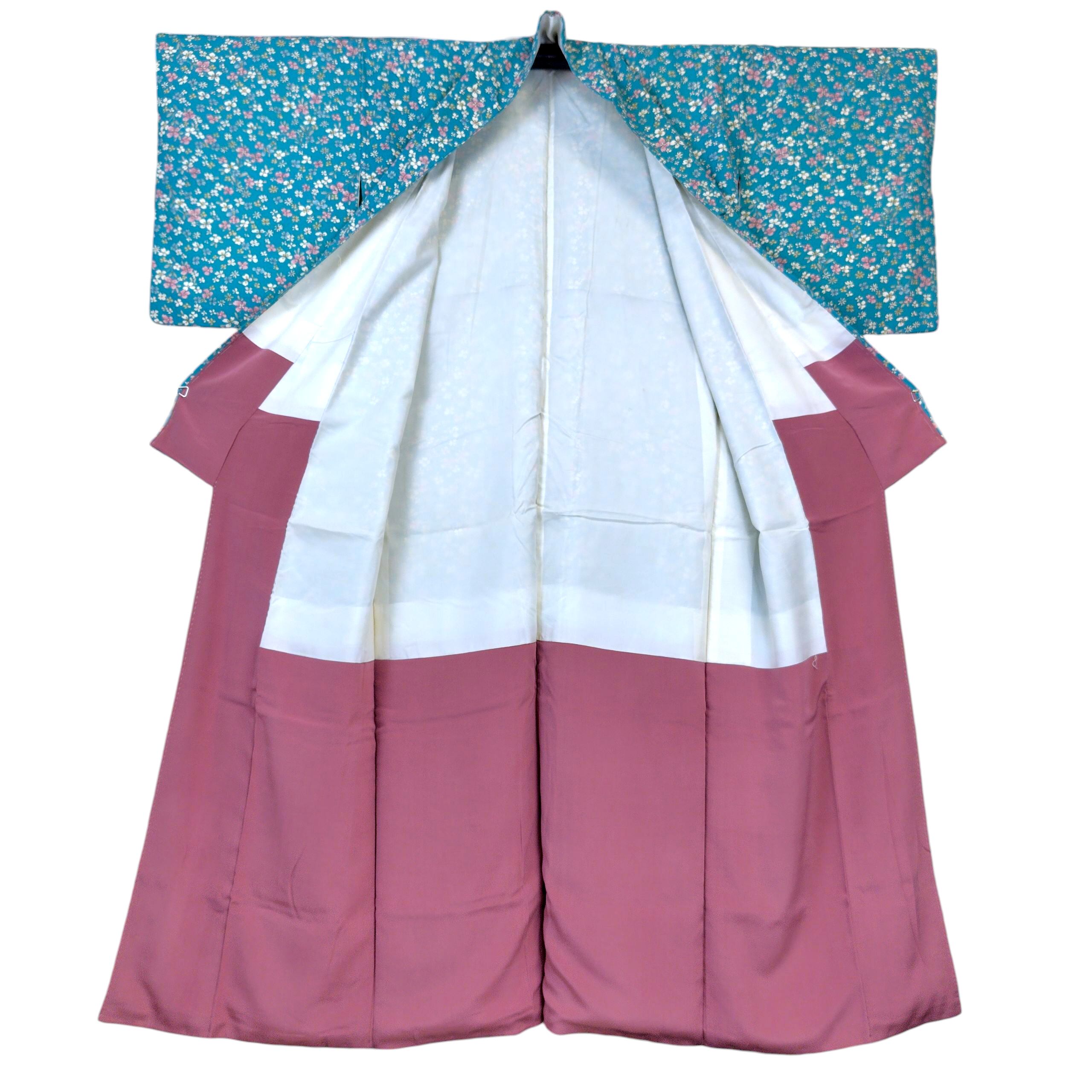 小紋 袷 浅葱色 可愛らしい花柄 リサイクル着物 小さいサイズ 袴 小柄な方向け