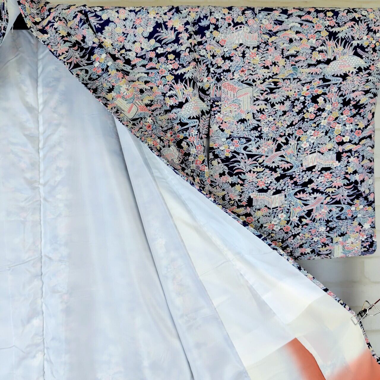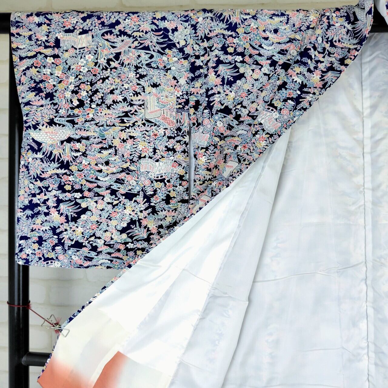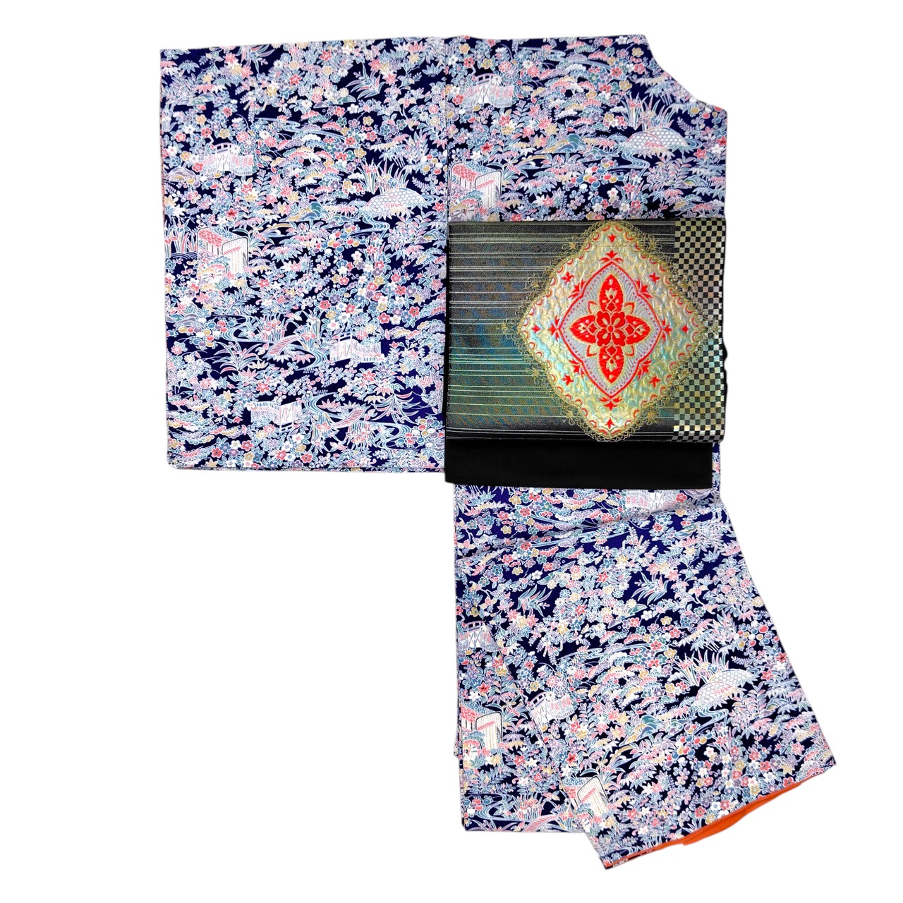 この小紋は、四季の植物や御所車、庭園などの細やかな柄が施されており、見る人を魅了する美しさがあります。