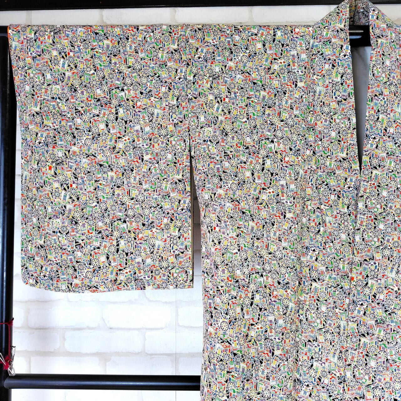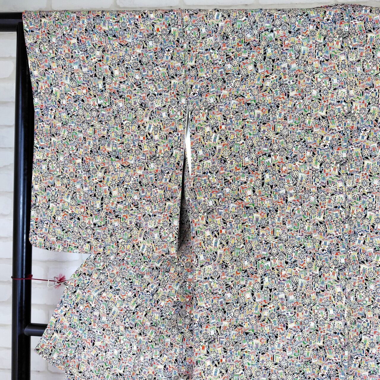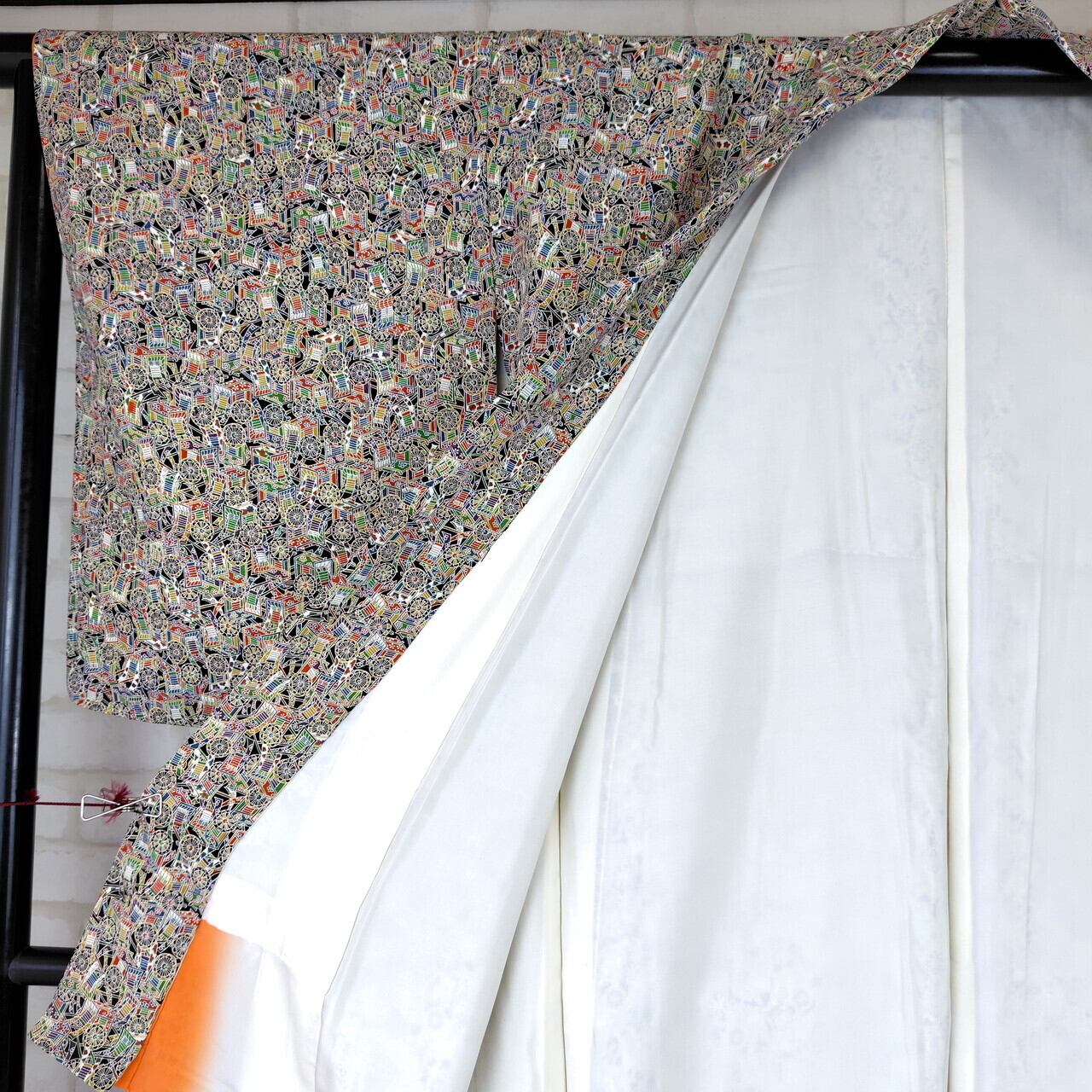 縮緬素材で作られたこの袷のリユース着物は、繊細な御所車のデザインが特徴で、あなたの装いに特別な魅力をプラスします。