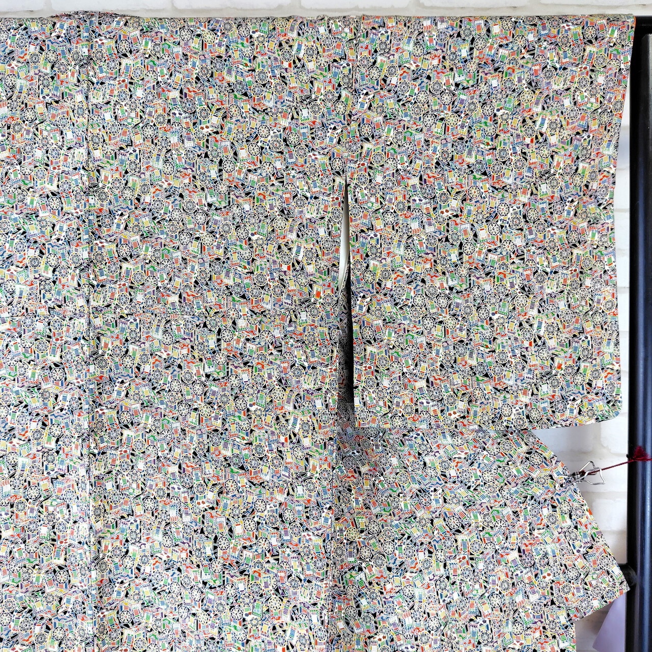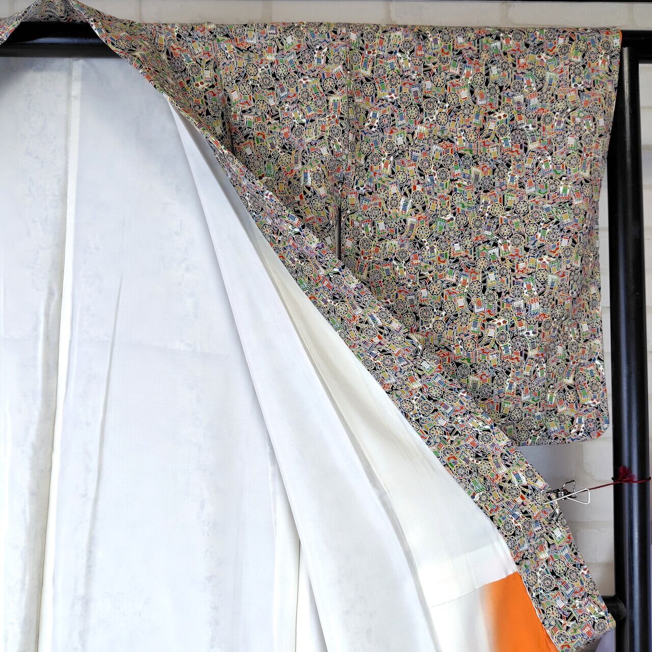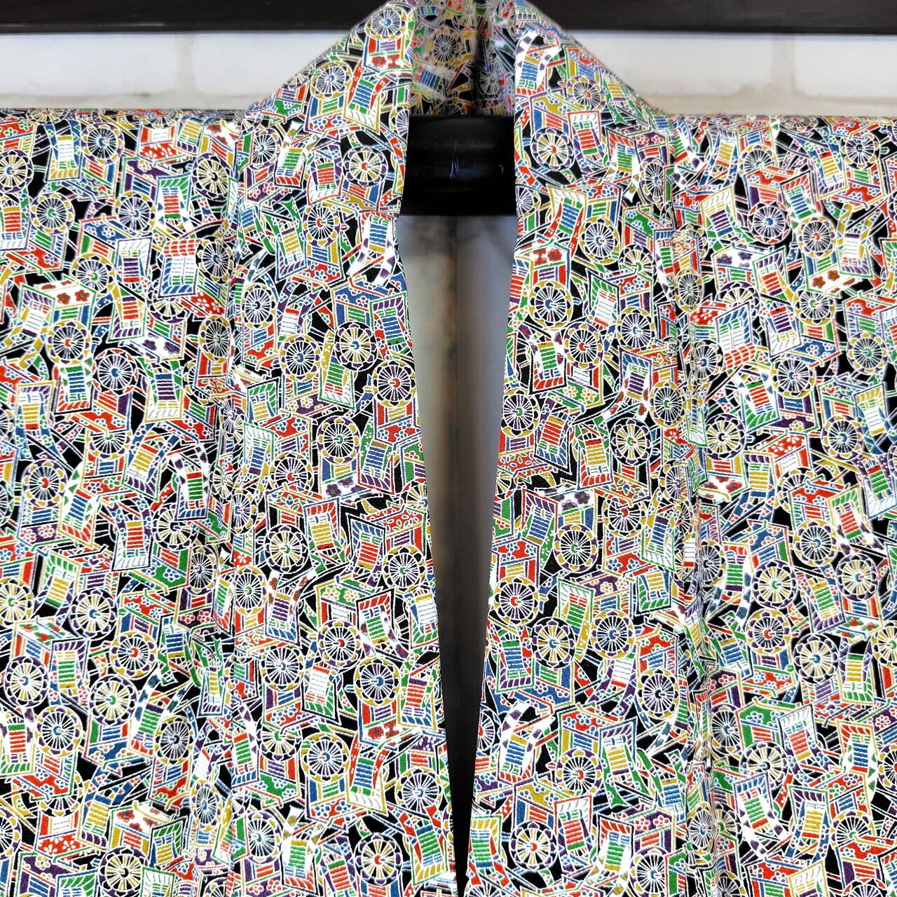 縮緬素材で作られたこの袷のリユース着物は、繊細な御所車のデザインが特徴で、あなたの装いに特別な魅力をプラスします。