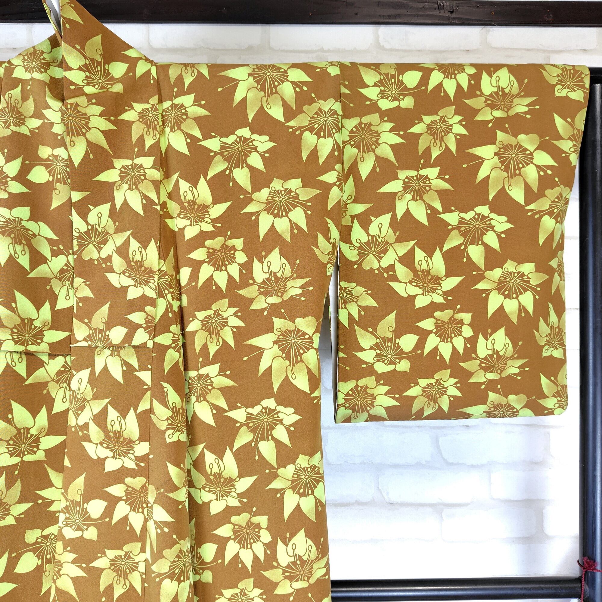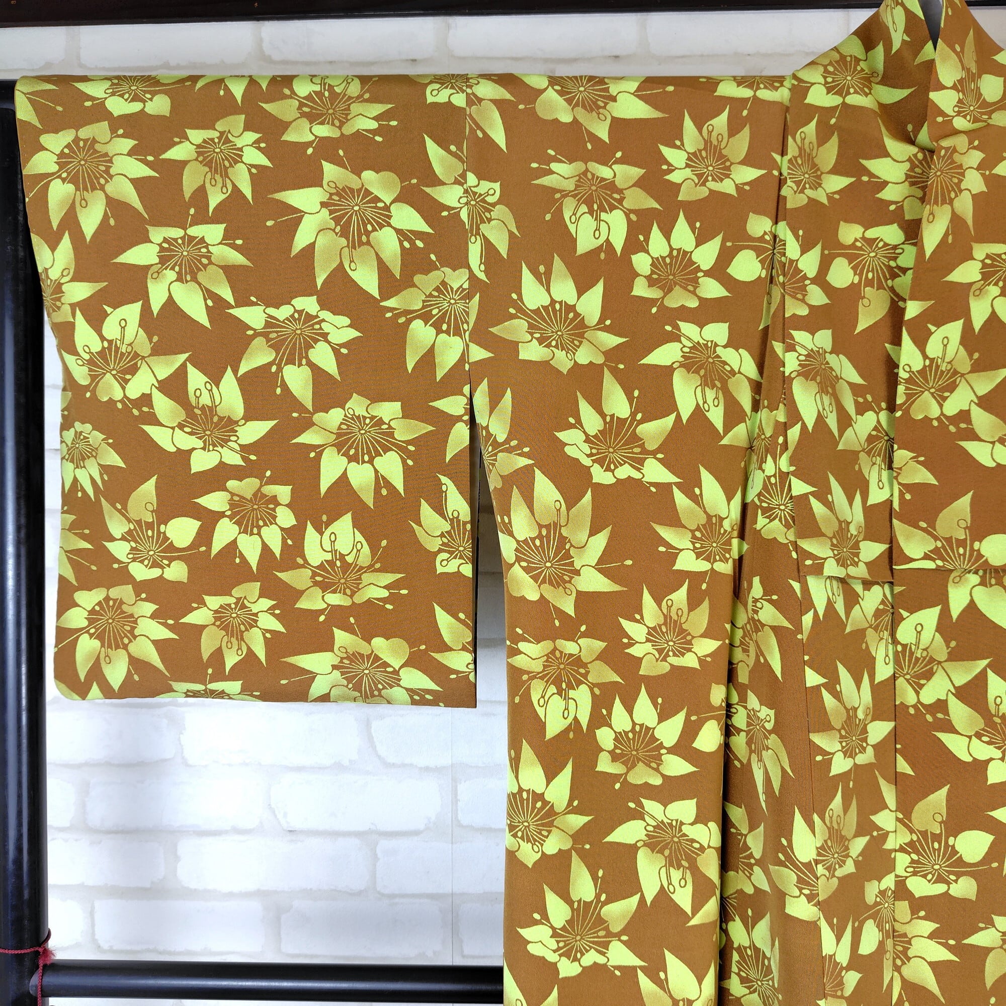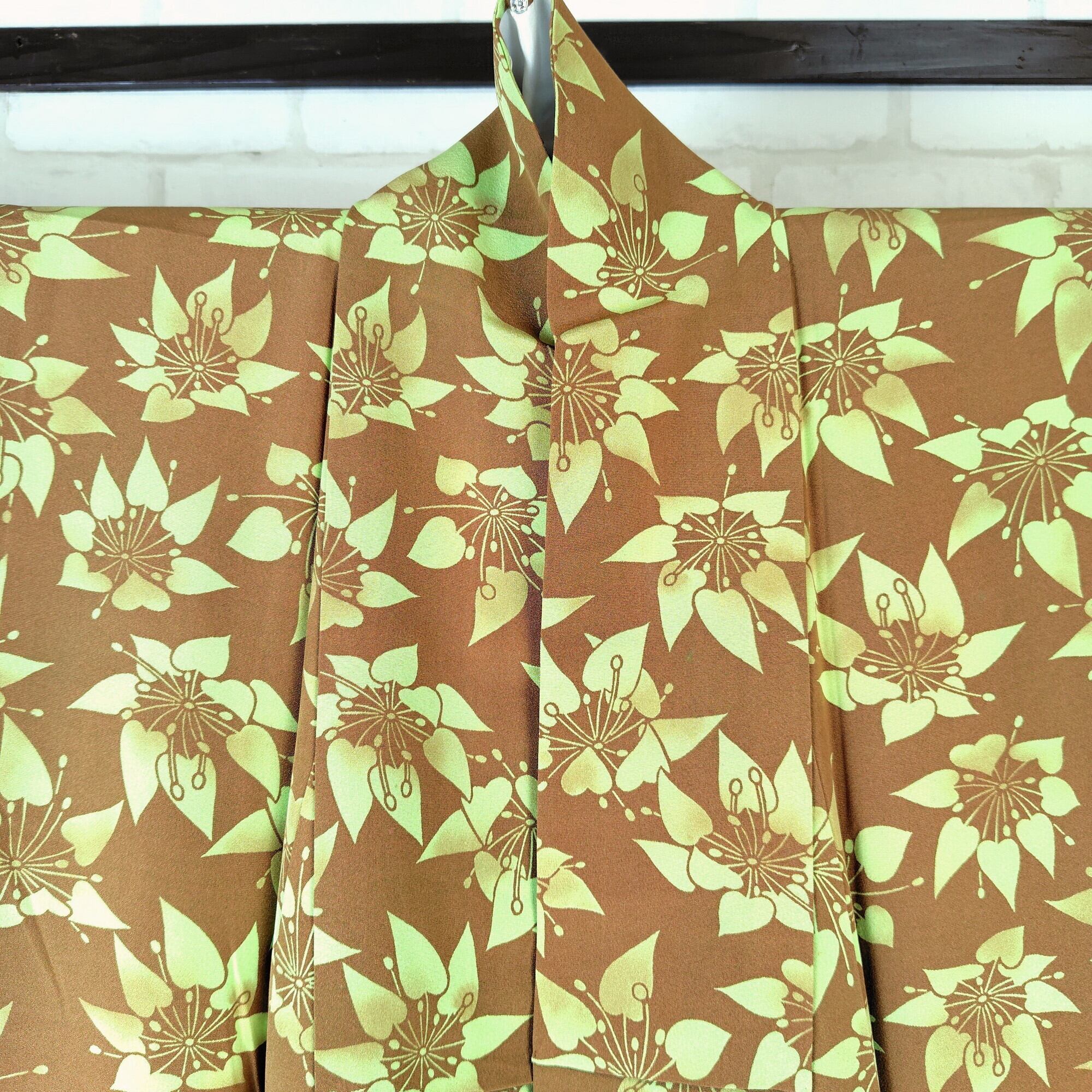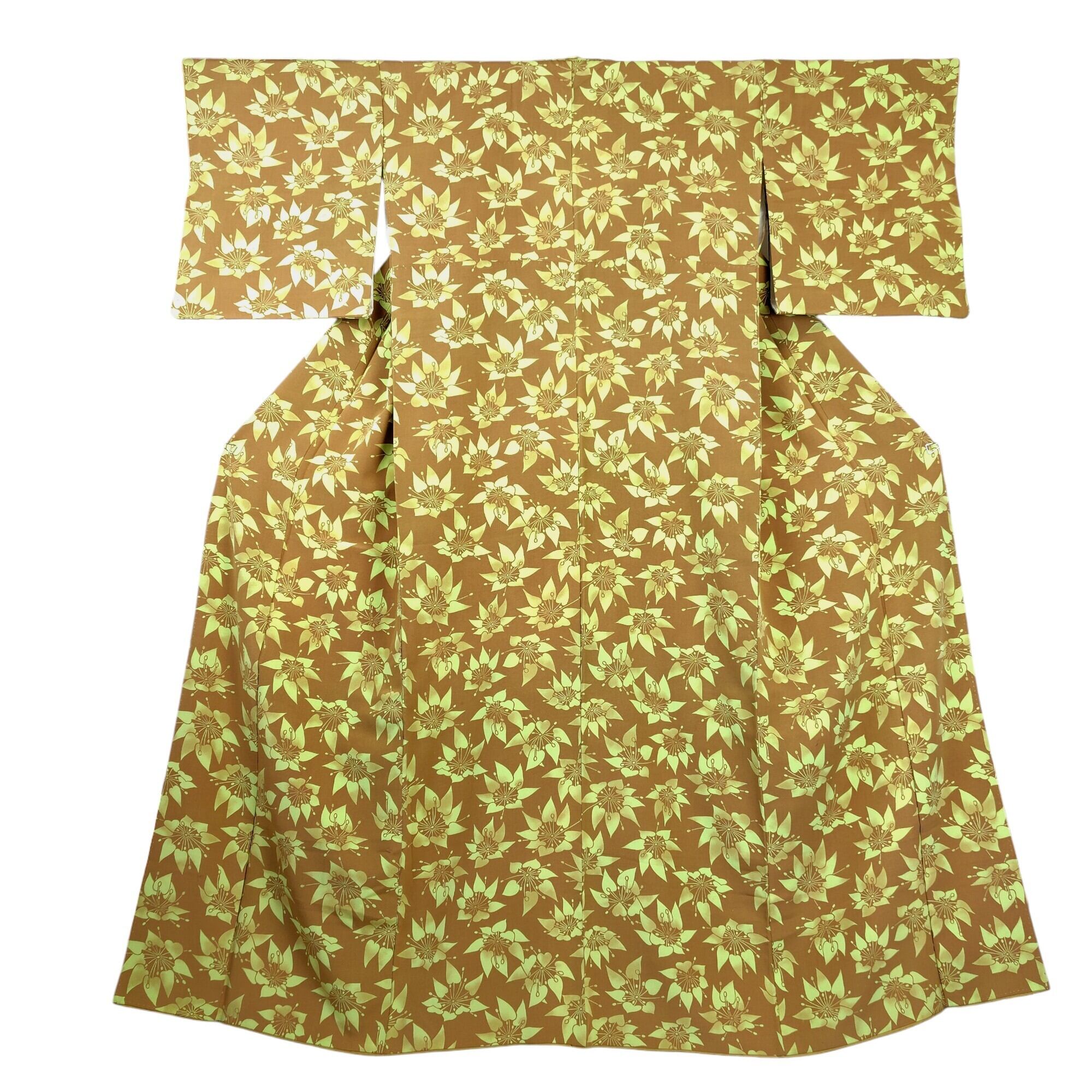 魅力的な茶色地にグリーンで抜かれた草花柄が特徴の袷の小紋が登場しました♪