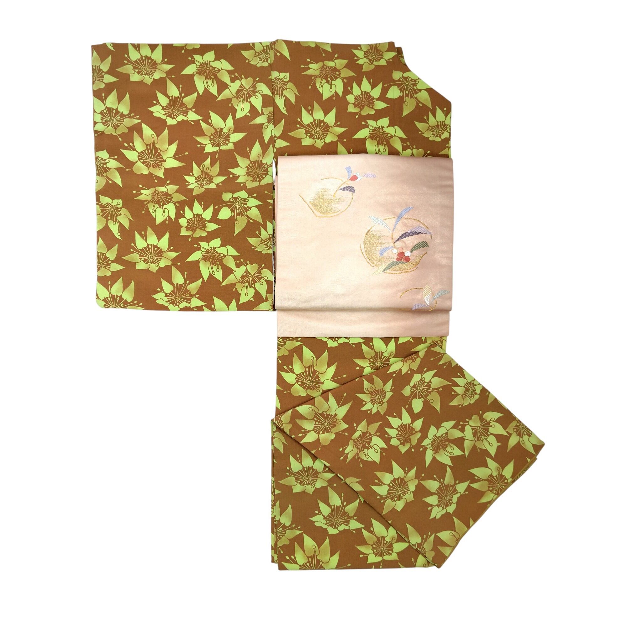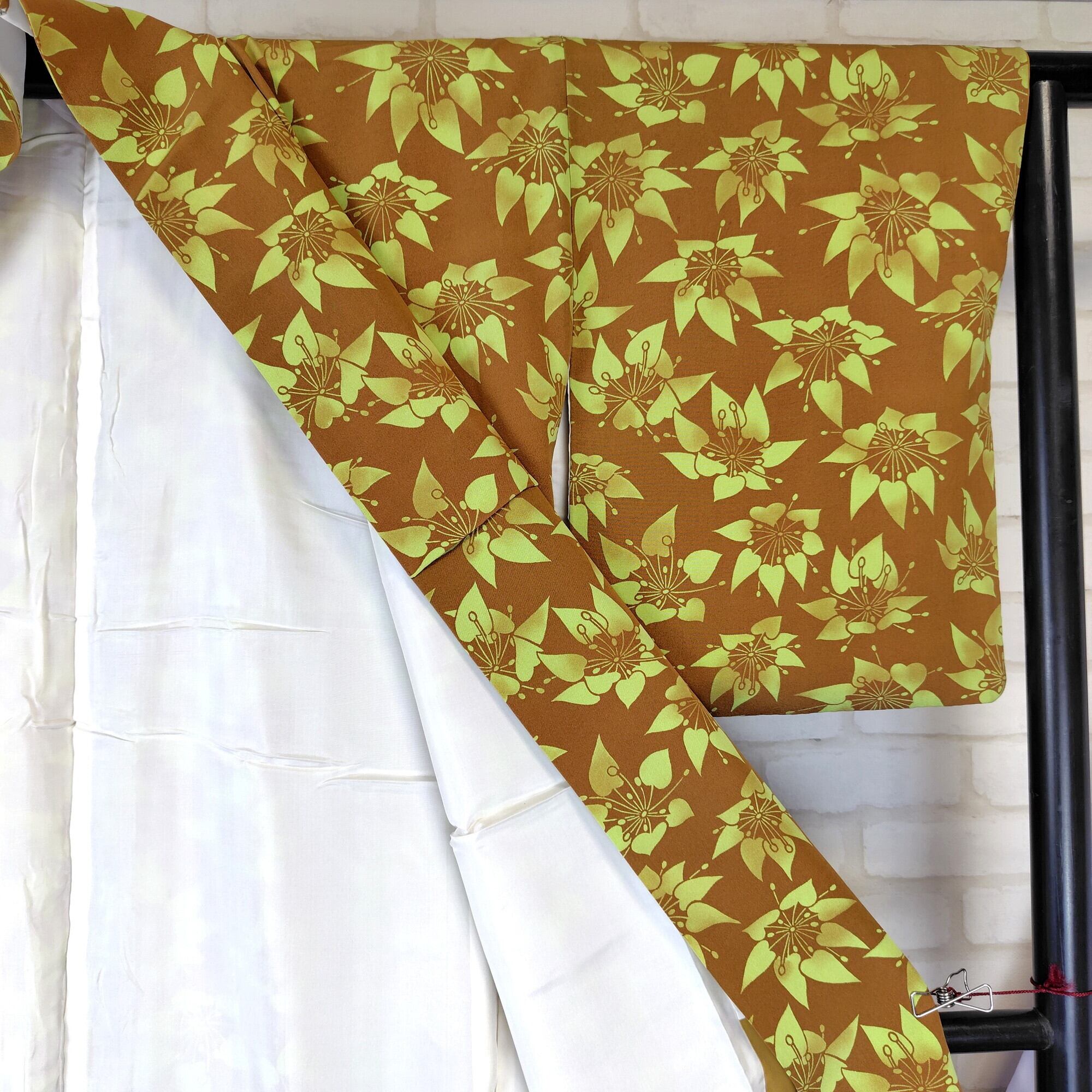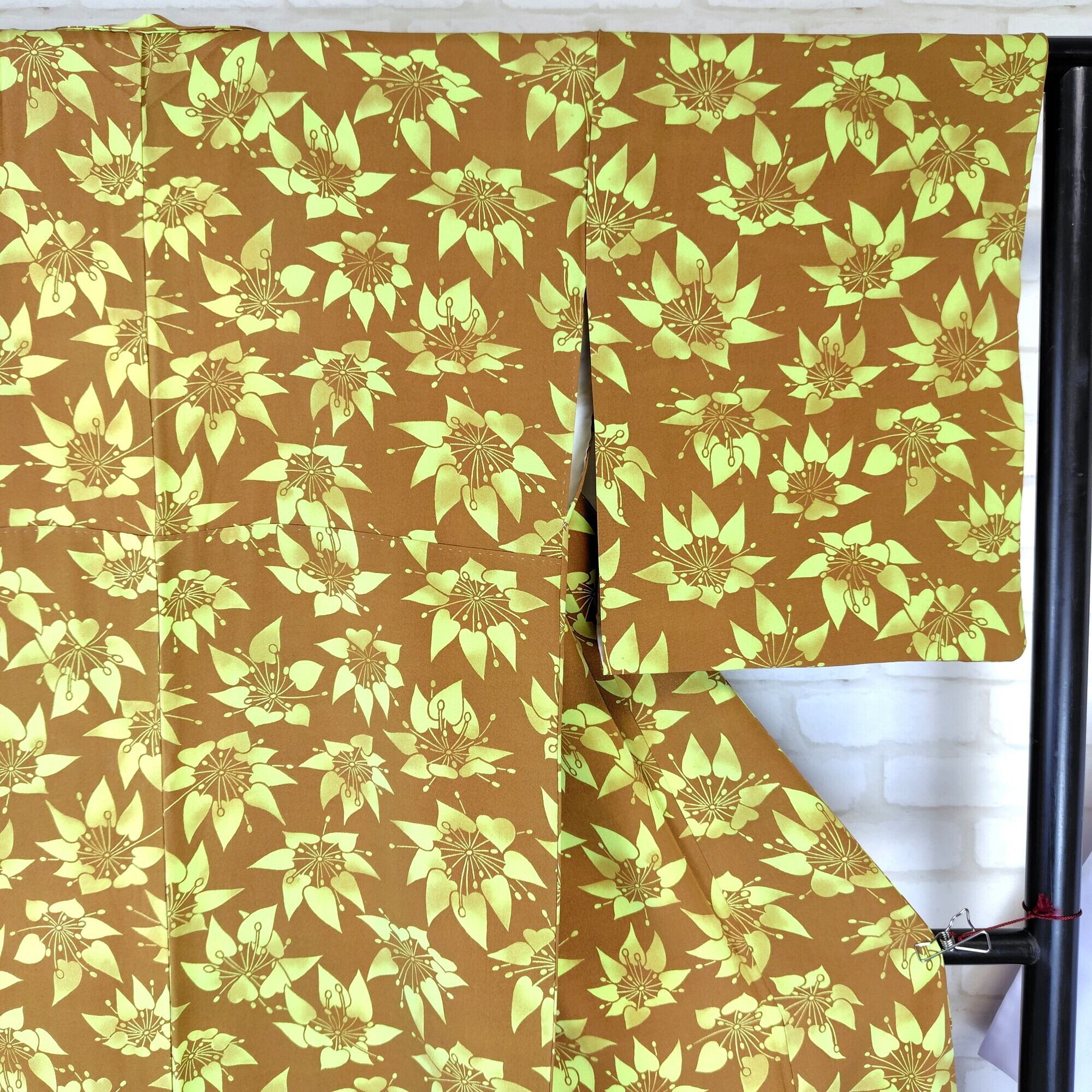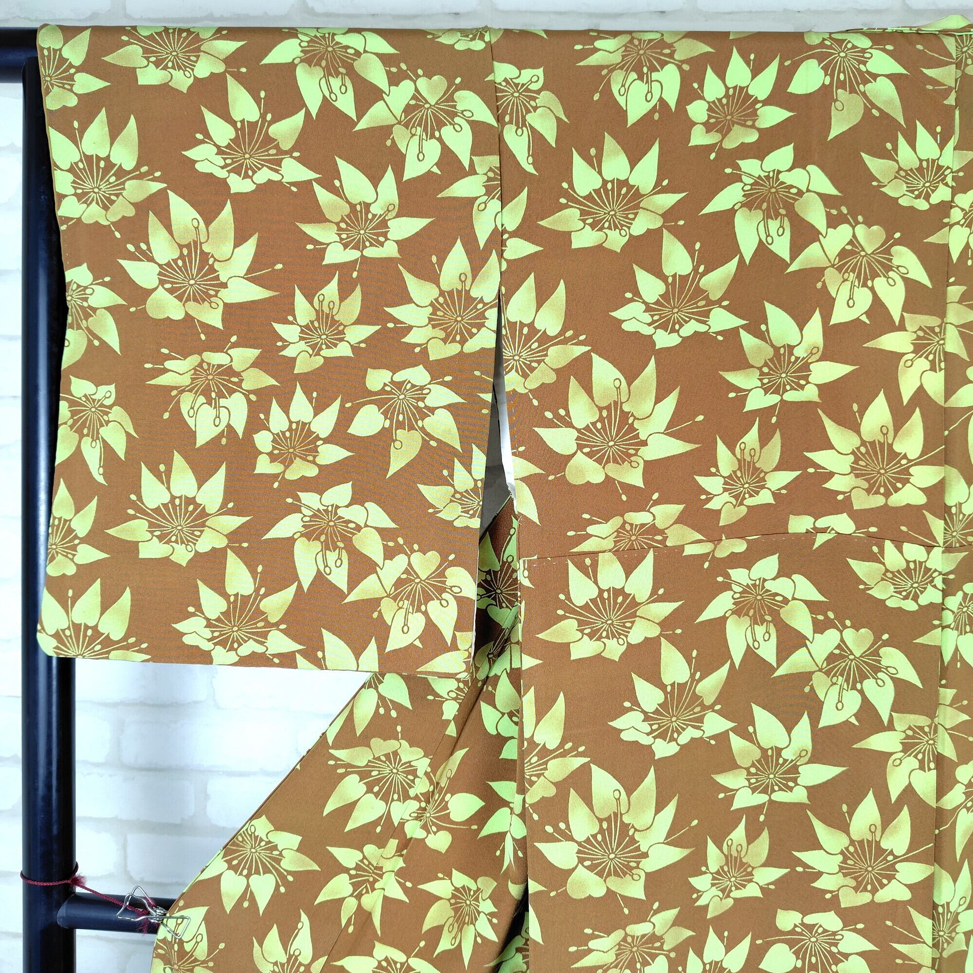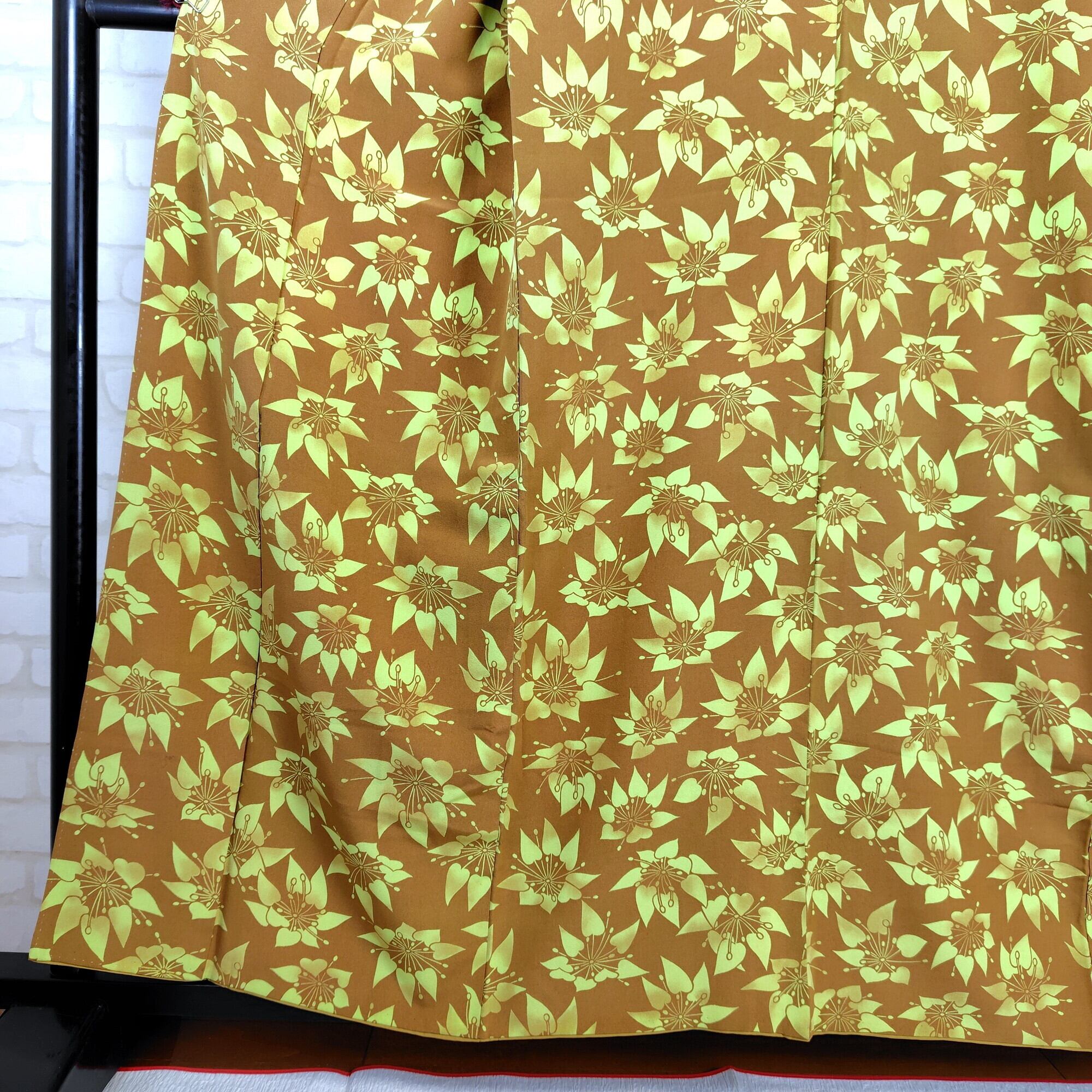 魅力的な茶色地にグリーンで抜かれた草花柄が特徴の袷の小紋が登場しました♪