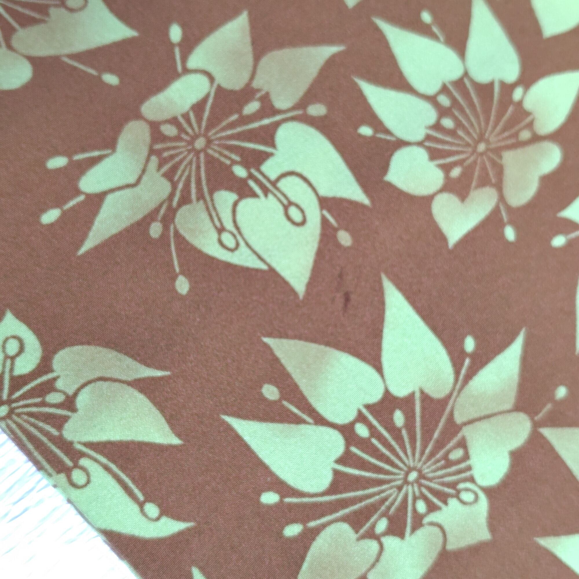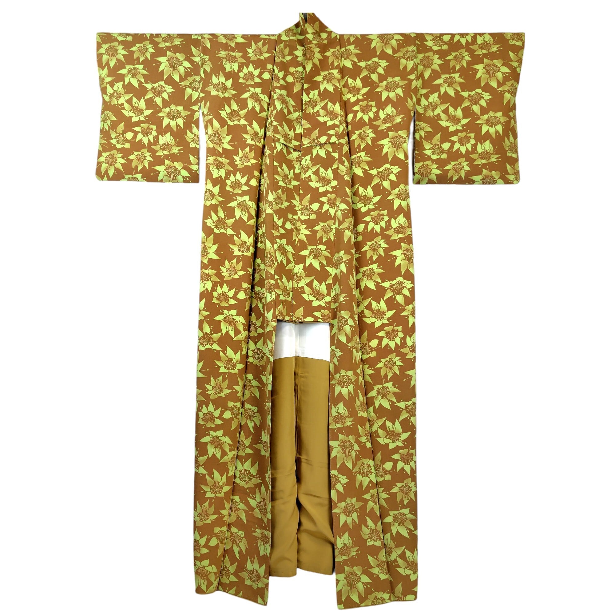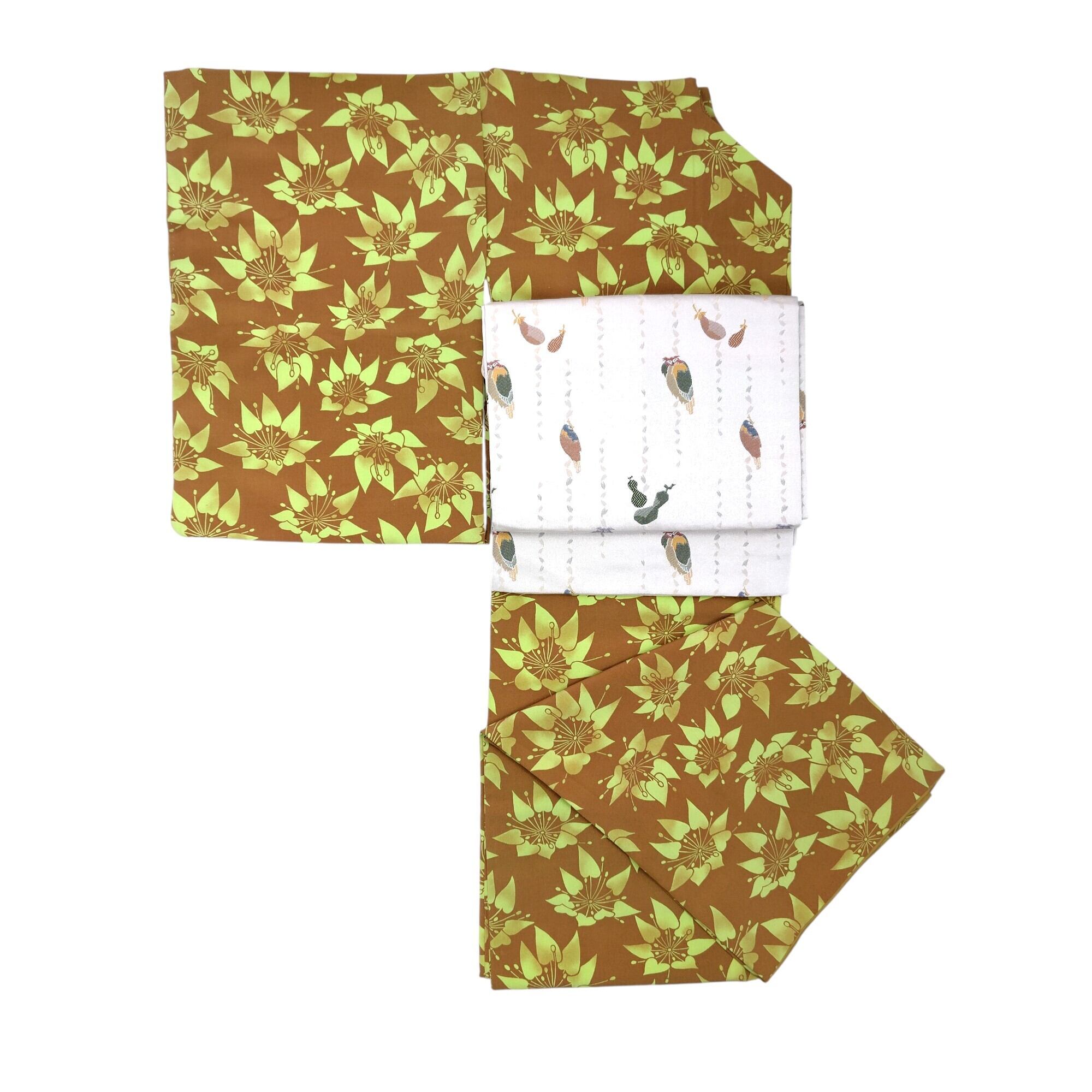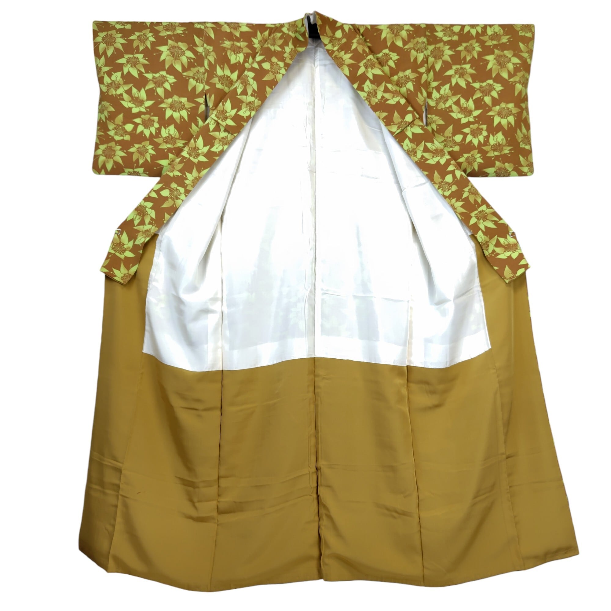 魅力的な茶色地にグリーンで抜かれた草花柄が特徴の袷の小紋が登場しました♪